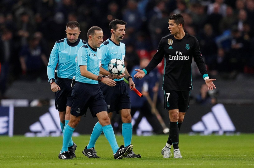 Camerele tv au reușit să filmeze un prim plan relevant cu arbitrul meciului care a fost surprins, cu o privire nesigură, într-un dialog cu arbitrul asistent de pe acea parte.