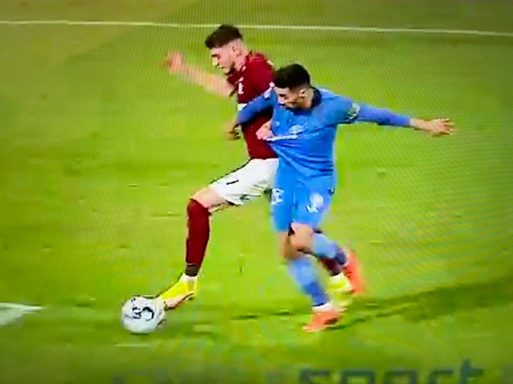 Analiza: Faza începe cu o lupta pentru balon intre cei doi jucători care folosesc brațele pentru a obține o poziție avantajoasă. Ceea ce se întâmplă în aceasta prima parte a fazei poate fi încadrat cu ușurință ca un mod normal, bărbătesc de a încerca să capete posesia. Belu ulterior își tine adversarul de tricou prelungit, tragandu-l peste el și astfel provocând faultul ce urmează.