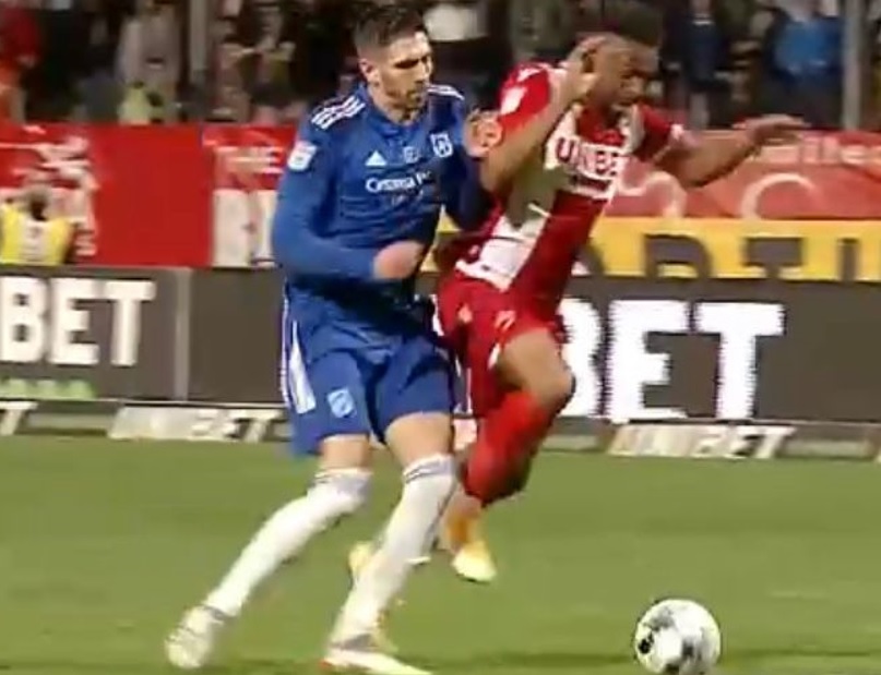 Ei bine dacă urmărim cu atenție faza din minutul 12 putem vedea cum fundașul craiovean intră direct în adversarul aflat în alergare, nu are nici o legătură atacul cu lupta normală pentru minge, întinde brațul folosindu-l în împingere și în final împiedică adversarul să își continue alergarea către poartă trântindu-l la pământ.