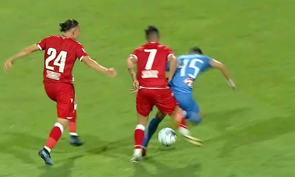 După câteva reluări putem vedea într-adevăr o mâna a lui Steliano Filip pe adversar, o ușoară ținere. Este foarte greu, dacă nu imposibil, la televizor să ne dăm seama de intensitatea ținerii sau dacă i-a provocat sau nu căderea.