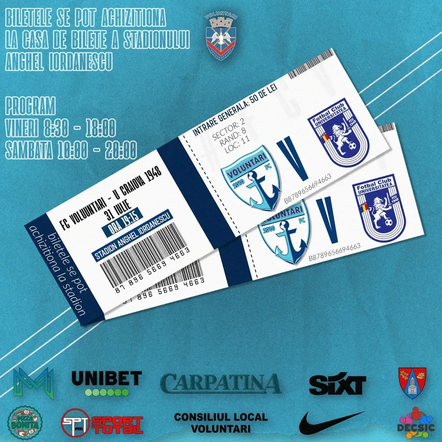 Biletele la partida dintre FC Voluntari și FC U Craiova 1948, contând pentru etapa a 3-a a Ligii 1, se vor putea achiziționa de la casa de bilete a stadionului Anghel Iordănescu( strada Niță Pintea, nr.41) după următorul program: