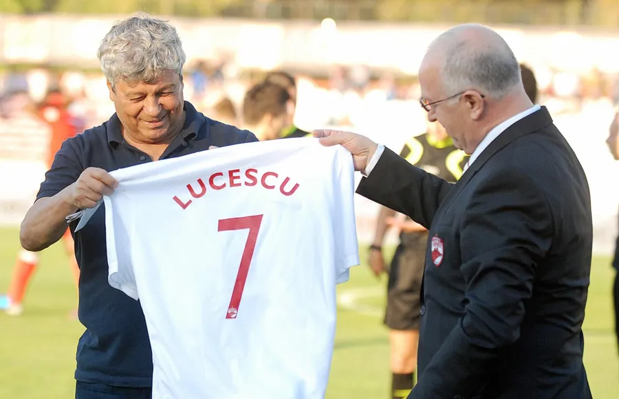 (Foto: Mircea Lucescu primește un tricou din partea lui Constantin Anghelache)