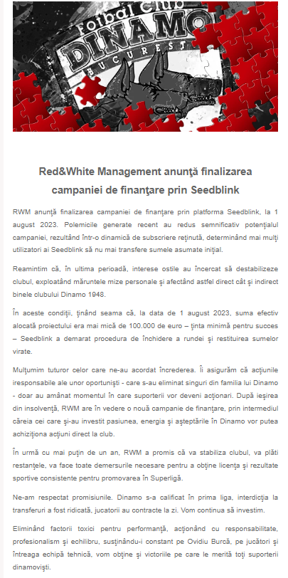 În acest context, în urma unei solicitări a ProSport, a venit și răspunsul cu privire la ceea ce va urma după închiderea rundei. Redăm comunicatul Red&White: „RWM anunță finalizarea campaniei de finanțare prin platforma SeedBlink, la 1 august 2023. Polemicile generate recent au redus semnificativ potențialul campaniei, rezultând într-o dinamică de subscriere reținută, determinând mai mulți utilizatori ai SeedBlink să nu mai transfere sumele asumate inițial”.