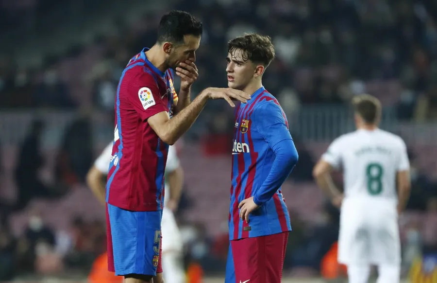 Sergio Busquets discută cu Gavi în timpul meciului jucat de Barcelona cu Elche