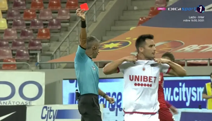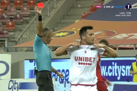 Vedeta lui Gigi Becali a căzut, iar arbitrul Radu Petrescu a fluierat eronat lovitură de la 11 metri. Mai mult, arbitrul i-a arătat fundașului dinamovist și cartonașul roșu, spre disperarea acestuia.