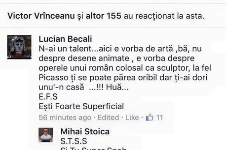 „N-ai un talent…aici e vorba de artă, bă, nu despre desene animate, e vorba despre operele unui român colosal ca sculptor, la fel Picasso ți se poate părea oribil dar ți-ai dori unul în casă…!!! Huă”, scrie Lucian Becali, care încheie cu „E.F.S. Ești foarte superficial”.