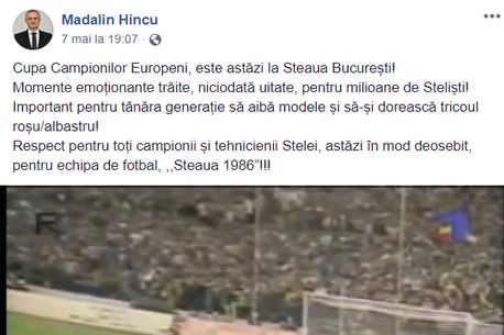 ”Cupa Campionilor Europeni este astăzi la Steaua București! Momente emoționante trăite, niciodată uitate, pentru milioane de steliști! Important pentru tânăra generație să aibă modele și să-și dorească tricoul roș/albastru! Respect pentru toți campionii și tehnicieni Stelei, astăzi în mod deosebit, pentru echipa de fotbal… Steaua 1986!”, a scris comandantul CSA Steaua, Mădălin Hîncu.
