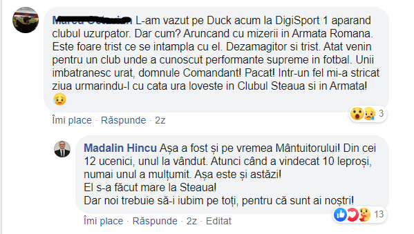 ”Așa a fost și pe vremea Mântuitorului! Din cei 12 ucenici, unul l-a vândut. Atunci când a vindecat 10 leproși, numai unul a mulțumit. Așa este și astăzi. El s-a făcut mare la Steaua! Dar noi trebuie să îi iubim pe toți, pentru că sunt ai noștri”, a scris comandantul CSA Mădălin Hîncu.