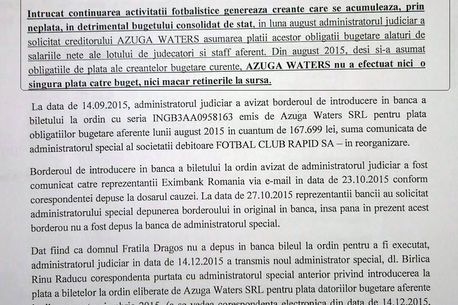 Între timp, Azuga Waters a depus la Judecătoria Sectorului 1 o contestație prin care încearcă să suspende executarea celor două bilete la ordin introduse de Birlică și validate de Brihac, în valoare de 588.000 de lei – bani care ar trebui să stingă datoria Rapidului către ANAF pe lunile ianuarie-martie 2016 – și să le anuleze pe celelalte 38.