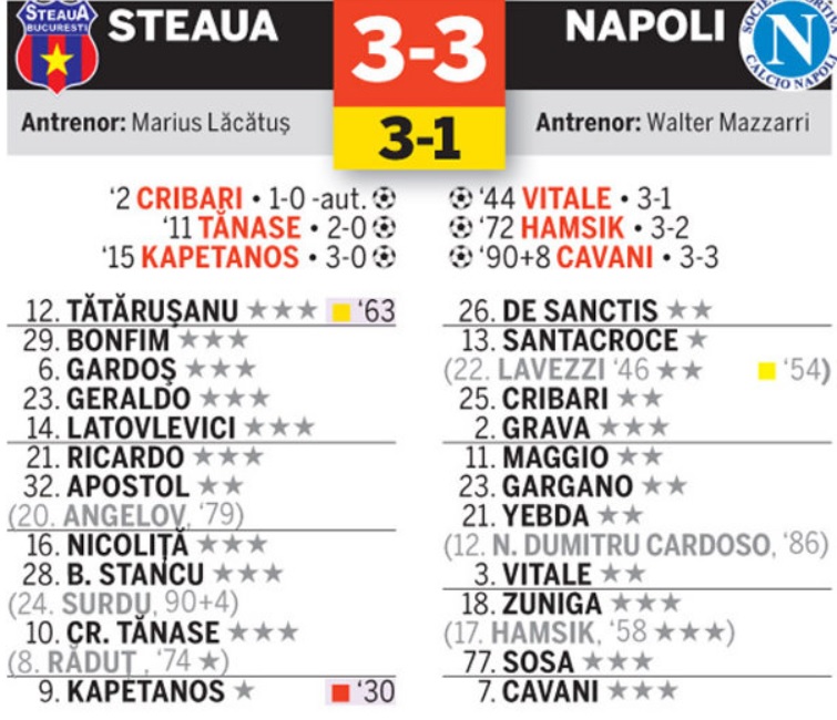 Gardoș, acum la Academica Clinceni, și-a adus aminte de acest meci memorabil. „N-au fost greșeli în apărare mari, dar ne-am jucat cu ocaziile. Apoi ei au pus presiune, gândiți-vă că-i aveau pe Hamsik și pe Cavani în atac. Eu, cu o lună înainte, jucam cu prin liga a doua. A fost ceva deosebit pentru mine, eram foarte emoționat și a fost un meci pe care mi-l voi aminti mereu.