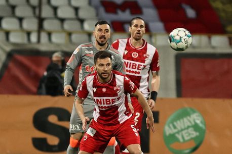 Alexandru Rauta (D), de la Dinamo, lupta pentru balon cu Ioan Hora (S), de la UTA Arad, in meciul de fotbal din etapa a doua a play-out-ului Ligii 1, disputat pe stadionul Dinamo din Bucuresti, marti, 20 aprilie 2021. GEORGE FILIP / MEDIAFAX FOTO