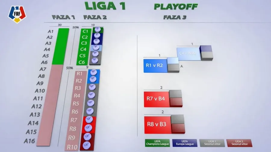 - Play-off cu 6 echipe, care vor juca tur-retur, și play-out cu 10 echipe, care vor juca doar un meci. Deoarece în play-out vor fi doar 9 jocuri, cinci echipe vor juca un meci în plus pe teren propriu.