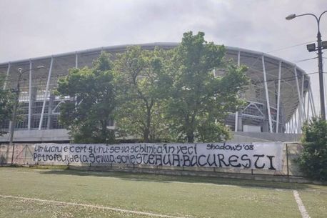 „Un lucru e cert și nu se va schimba în veci, pe trofeul de la Sevilla scrie Steaua București”, este mesajul afișat de către ultrașii brigăzii Shadows, lângă noul stadion din Ghencea.