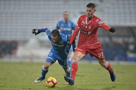 Ricardo Grigore (dreapta, în roșu), în duel cu Alexandru Mitriță în meciul Dinamo – U Craiova 3-0, din Ștefan cel Mare.