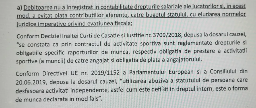 Debitoarea (n.r. SC Dinamo 1948 SA) nu a înregistrat în contabilitate drepturile salariale ale jucătorilor și, în acest mod, a evitat plata contribuțiilor aferente către bugetul statului, cu eludarea normelor juridice imperative privind evaziunea fiscală”.