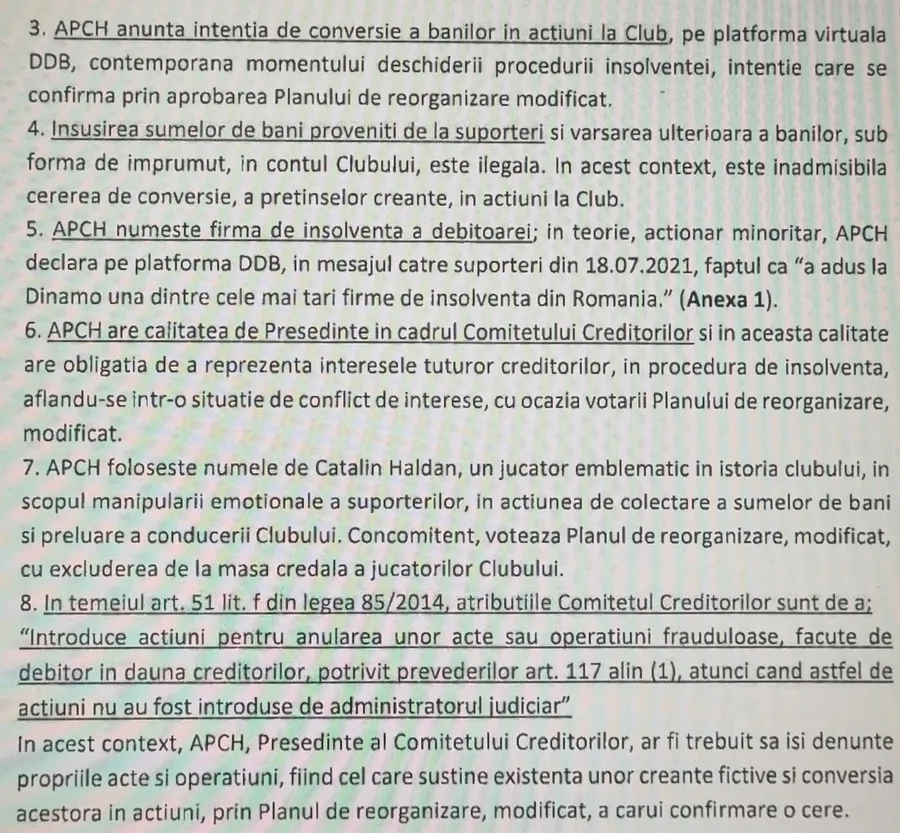 Noi vă solicităm să analizați în conformitatea articolului 39, în raport cu modificările conținute în plan, eventual cu ulterioarele consecințe ale debitoarei care ar urma să iasă din rerorganizare, modalitate în care APCH înțelege să recupereze creanța pe care o deține în tabelul de creanțe”- avocat CS FC DINAMO, „Dinamo – Badea”