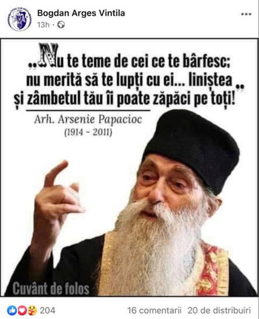 „Nu te teme de cei care te bârfesc; nu merită să te lupți cu ei…Liniștea și zâmbetul tău îi poate zâpăci pe toți!”, este citatul distribuit de Bogdan Argeș Vintilă pe Facebook și care îi este atribuit lui Arsenie Papacioc.