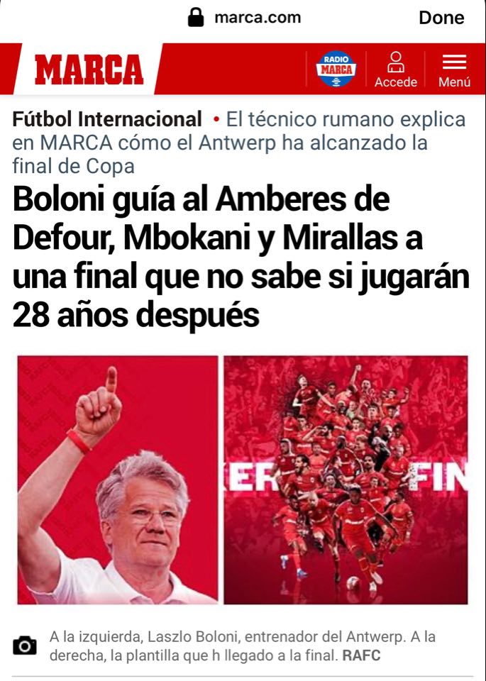 „În acest sezon am ajuns în playoff și urma să jucăm finala Cupei Belgiei”, își amintește Boloni. O calificare istorică care a venit după ce a trecut printr-un traseu dificil: a eliminat Lokeren în prelungiri, Genk la penalty-uri, Standard în sferturi și Kortrijk în semifinale.