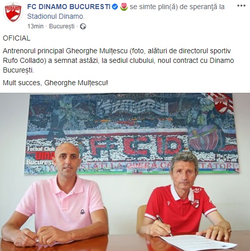 Dinamo a anunțat oficial noul antrenor. Gigi Mulțescu a semnat un nou contract cu echipa din „Ștefan cel Mare”. Anunțul a fost postat pe pagina de Facebook a clubului. În poza oficială, antrenorul apare lângă noul director sportiv, spaniolul Rufo Collado. Nu se spune nimic despre obiectivele tehnicianului și nu se dau amănunte despre durata înțelegerii.