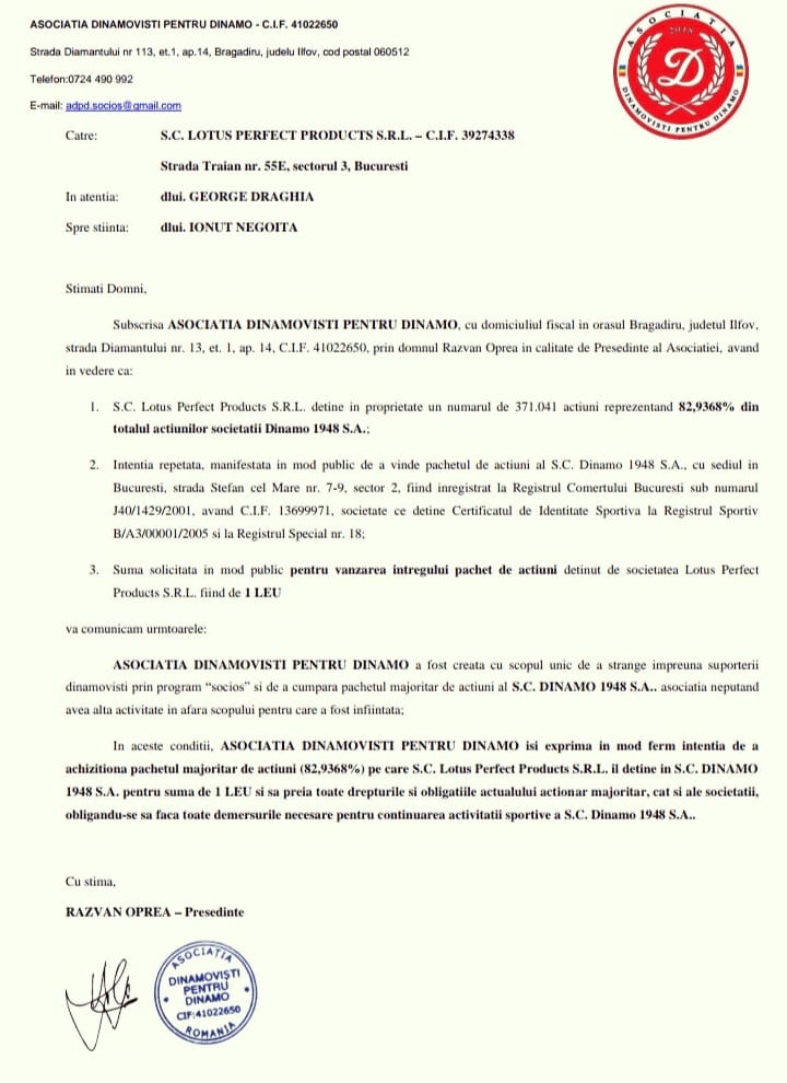 În urma ultimelor declarații venite dinspre actualul patronat al lui Dinamo, vă anunțăm pe toți suporterii dinamoviști că în această seară, Asociația Dinamoviști Pentru Dinamo a trimis o ofertă scrisă de