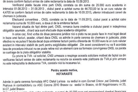 La începutul lunii octombrie, juristul clubului prahovean din Liga C județeană – Oțelul Larissa – Bogdan Filcea, a depus la Comisia de Disciplină a Federației Române de Fotbal un memoriu privind neîndeplinirea clauzelor contractuale de către prim-divizionara Corona Brașov.