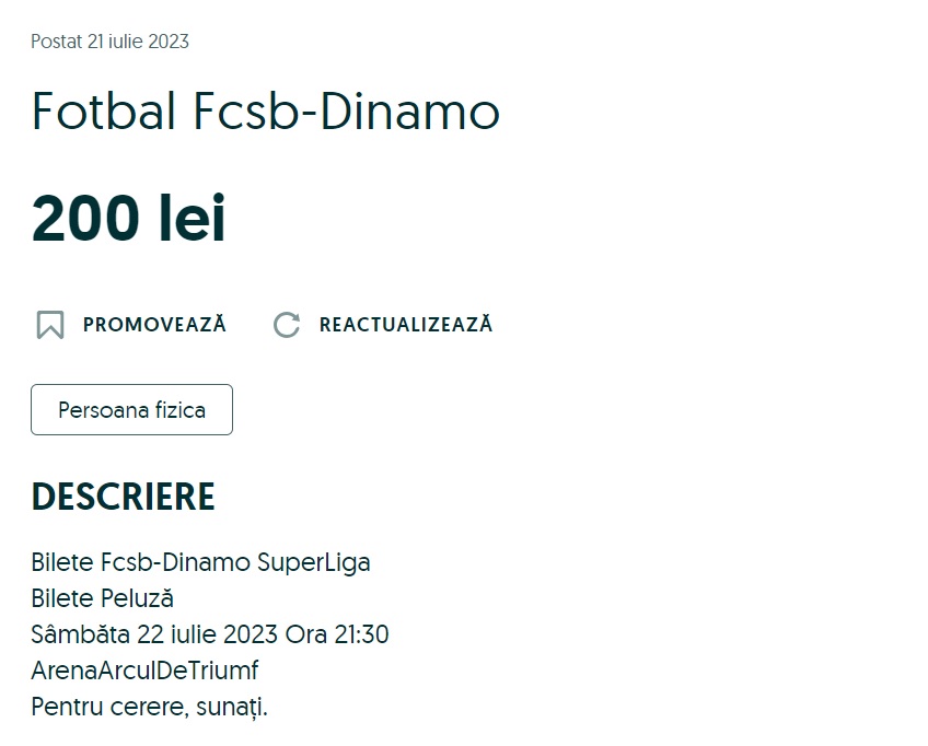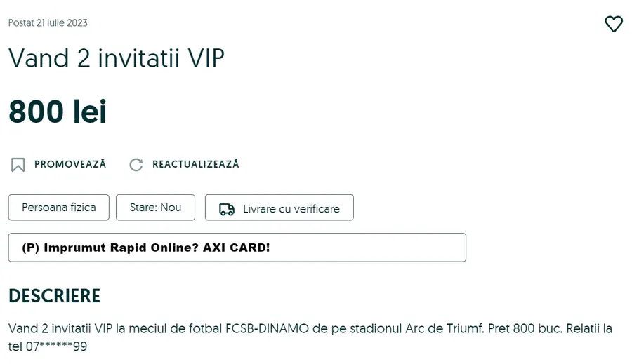 Nebunie înaintea meciului FCSB – Dinamo! Iar asta și pentru că doar 7.500 de spectatori vor putea asista la derby-ul din etapa a doua a Superligii. Așa cum era de așteptat, prețurile la bilete „au luat-o razna” pe OLX: astfel, un tichet în zona VIP costă 800 de lei.