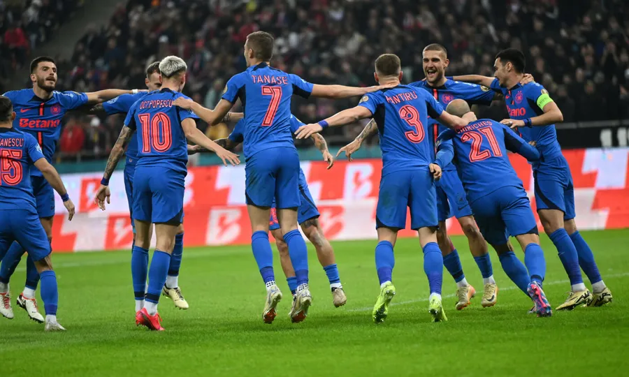Hora a bucuriei steliste cu Mihai Popescu, George Daniel Bîrligea si Adrian Gheorghe Șut dupa un gol reusit in meciul de fotbal dintre Dinamo Bucuresti si FCSB, contand pentru Cupa Romaniei
