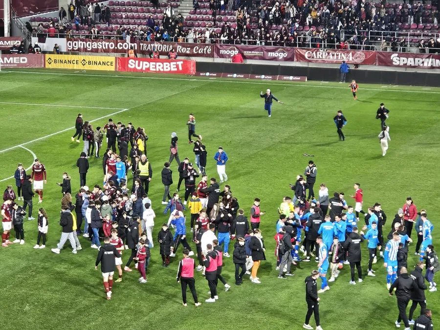 „Să nu intrați pe teren la finalul meciului”, a fost mesajul pentru cei mici, care au așteptat până în ultimul moment un succes al Rapidului. N-a fost să fie nici măcar un rezultat de egalitate, din moment ce vedeta Mitriță a dat lovitura în al treilea minut al prelungirilor.