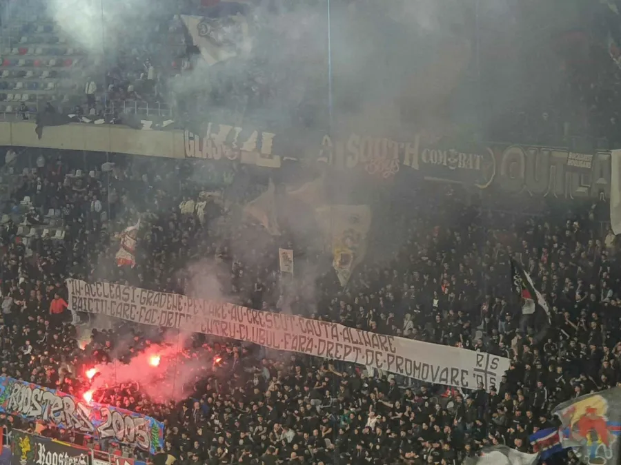 Fanii l-au ignorat complet pe patronul roș-albaștrilor și s-au concentrat pe realizarea unor scenografii deosebite în peluză, dar și pe transmiterea unor mesaje pentru cei care n-au reușit să rezolve dreptul de promovare în Superliga.