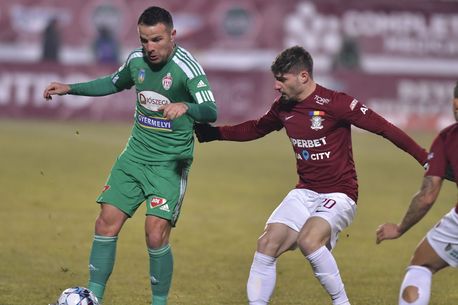 Cristi Marian Barbut si Morais Junior Iraneuton Sousa in meciul de fotbal dintre Rapid Bucuresti si Sepsi OSK Sfantu Gheorghe, contand pentru Liga 1 Casa Pariurilor, desfasurat pe Stadionul Orasenesc din Mioveni, vineri 11 februarie 2022. © FOTO:Razvan Pasarica/SPORT PICTURES
