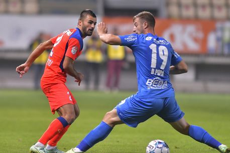 Claudiu Andrei Keseru si Paul Alexandru Iacob in meciul de fotbal dintre Chindia Targoviste si FCSB, contand pentru Liga 1 Casa Pariurilor, desfasurat pe Stadionul Ilie Oana din Ploiesti, vineri 1 octombrie 2021. © FOTO:Razvan Pasarica/SPORT PICTURES