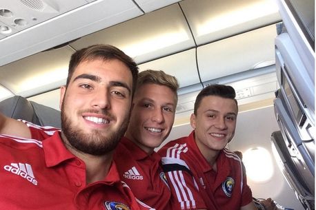 Cojocaru, alături de Iulian Roșu, fostul său coleg de la Steaua, aici într-un selfie efectuat cu ocazia unei deplasări a lotului național spre Macedonia