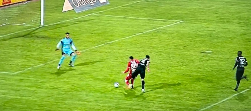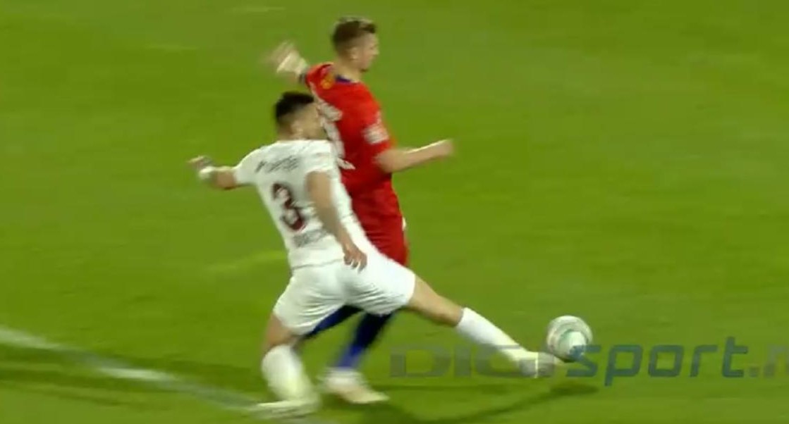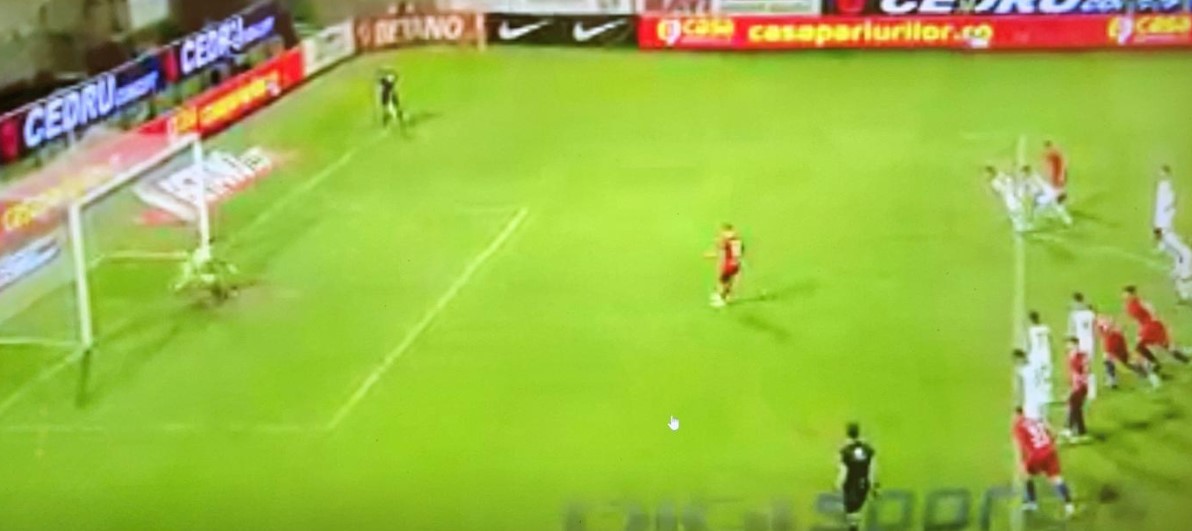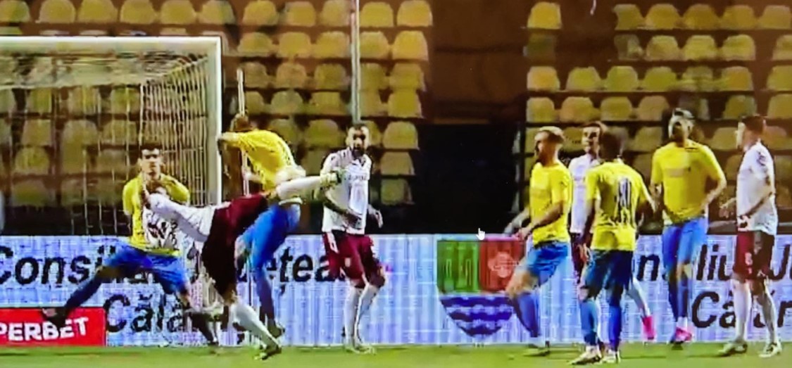 Aceasta este intenția lui și modul în care o face este periculos pentru propria echipă. Astfel, deși reluările nu sunt foarte clare, decizia în acest caz ar fi trebuit să fie lovitură de la 11 metri și cartonaș galben.