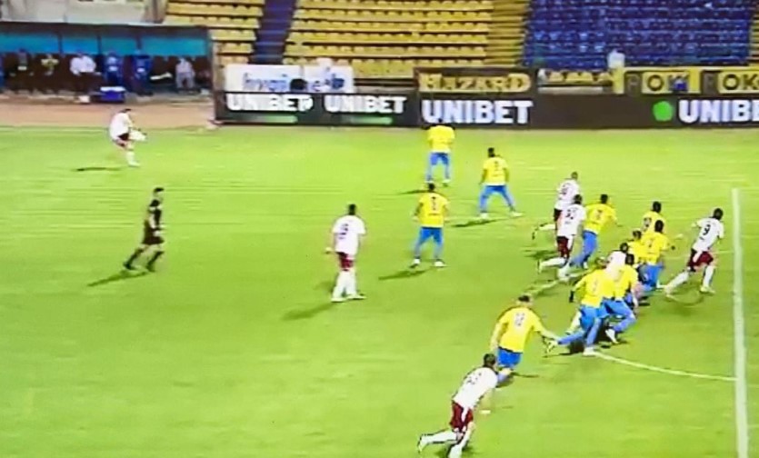 Astfel primul gol al celor de la Rapid a fost înscris în urma unei lovituri libere în minutul 1. Așa cum se vede și în captura de mai jos un jucător atacant se afla într-o poziție evidentă de ofsaid. Cu toate acestea poziția în sine nu este o greșeală.