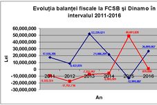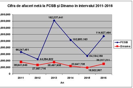 Datele contabile depuse de cele două cluburi la Fisc, în perioada 2011-2016, scot în evidență o prăpastie. Nu există an în care Dinamo să fi fost măcar aproape de FCSB la cifra de afaceri. Cea mai mică distanță s-a consemnat în 2012, de 17,3 milioane de lei (circa 4 milioane de euro) – când Dinamo a făcut afaceri de 27 de milioane, iar FCSB – de 44,4 milioane.
