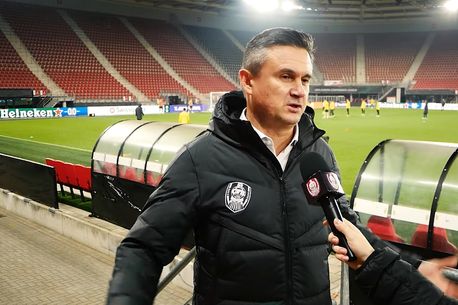 Cristian Balaj (S) si Valeriu Argaseala (C) discuta inainte de inceperea meciului de fotbal dintre echipele CFR Cluj si FCSB, din etapa a 5-a a play-off-ului Ligii 1, disputat pe stadionul Dr. Constantin Radulescu din Cluj-Napoca, duminica, 17 aprilie 2022. FLAVIU BUBOI / MEDIAFAX FOTO