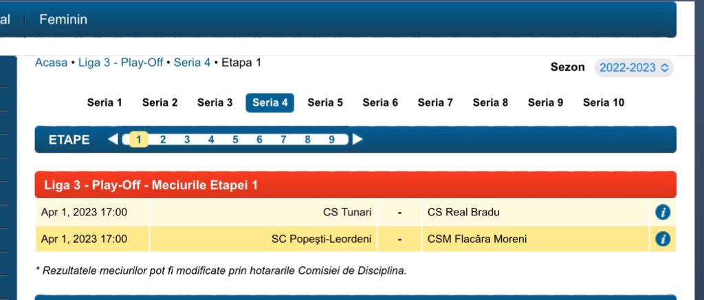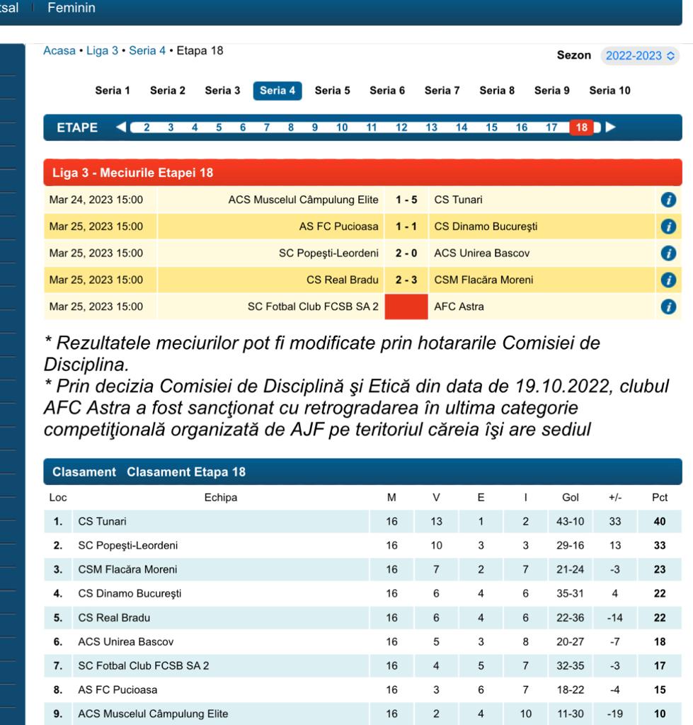 În schimb, la secțiunea Liga 3 – Play-Off, seria 4, apar CS Tunari, Popești-Leordeni, Flacăra Moreni și Real Bradu.