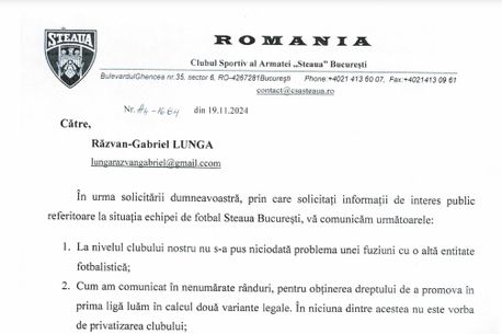 „În urma solicitării dumneavoastră, prin care solicitați informații de interes public referitoare la situatia echipei de fotbal Steaua București, vă comunicăm următoarele: