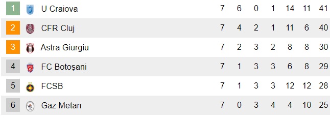 Craiova este lider în Liga 1 după cele șapte etape care s-au jucat în play-off-ul Ligii 1, iar lupta pentru titlu se anunță una pe muchie de cuțit, CFR fiind la un singur punct în spatele oltenilor.