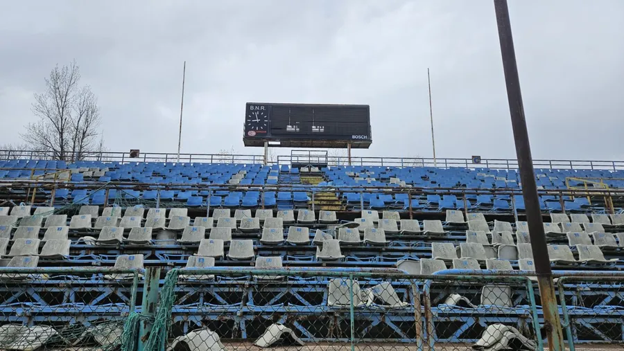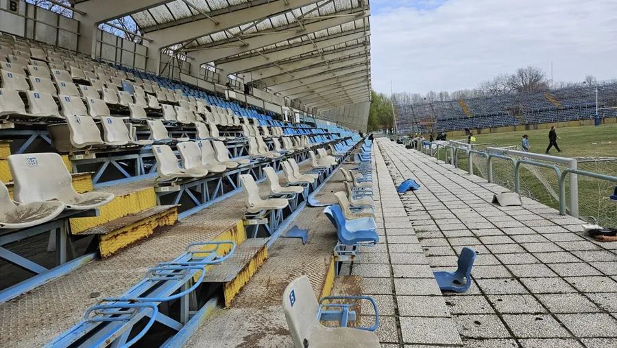 Decorul e dezolant, iar vegetația a cucerit, din loc în loc, treptele de beton. Rugina s-a întins precum o hidră, de la peluze, la tribuna 1 și s-a cocoțat pe picioroangele de metal întortocheat ale nocturnei. Tribunele care dădeau, cândva, un aer de arenă englezească, au rămas chele de scaune la peluza nordică. În partea cealaltă, la peluza cu tabela, rândurile sunt știrbe. La fel și la tribuna oficială, unde, pe fâșii întregi, scaunele ori lipsesc, ori sunt sparte.