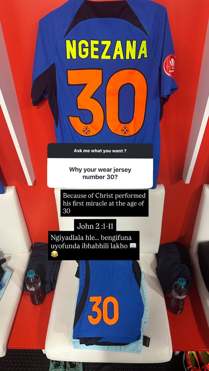 Într-un scurt dialog pe rețelele sociale cu fanii săi, Ngezana a explicat de ce și-a dorit foarte mult să preia acest număr. „Pentru că Hristos a săvârșit prima Sa minune la vârsta de 30 de ani”, a transmis fundașul central.