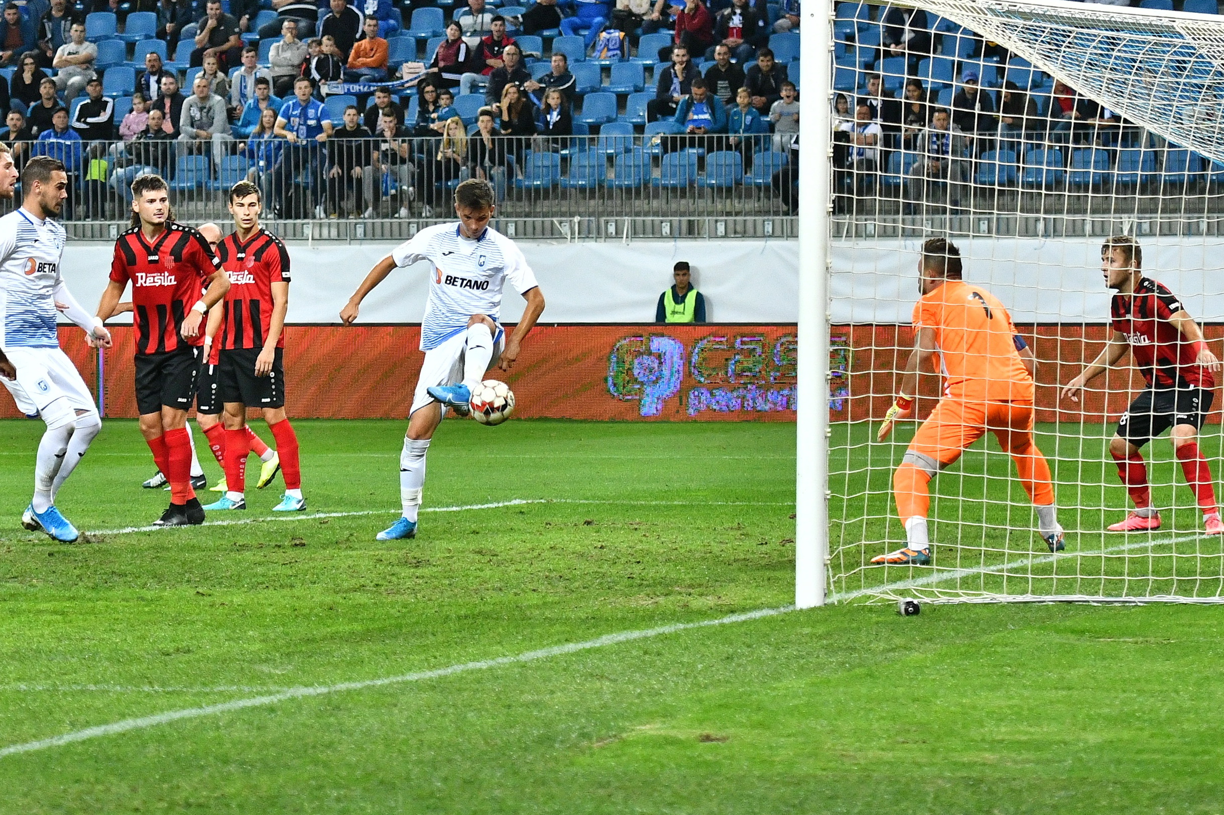Luis Emanuel Nitu (C), de la Universitatea Craiova, inscrie un gol in timpul meciului de fotbal contra echipei CSM Resita din saisprezecimile Cupei Romaniei, disputat pe stadionul Ion Oblemenco din Craiova, miercuri, 25 septembrie 2019. REMUS BADEA / MEDIAFAX FOTO