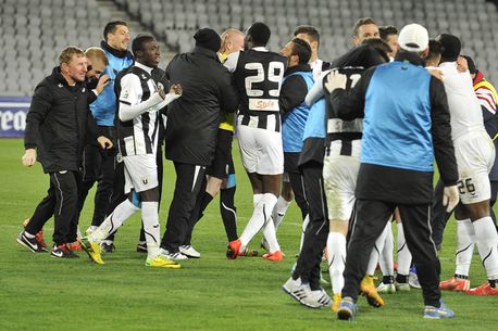Calificarea Universității în finala Cupei României după ce Veselovsky a parat două lovituri de pedeapsă l-a transformat pe portar în eroul acestui meci care va intra în istoria clubului. Foto: Dan Tăuțan