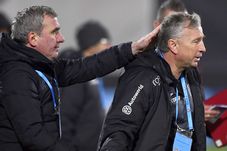 Dan Petrescu (S), antrenorul echipei CFR Cluj, si Gheorghe Hagi (D), antrenorul echipei FC Viitorul, se imbratiseaza inainte de meciul de fotbal contra echipei FC Viitorul, din etapa a XXV-a a Ligii 1 Betano, disputat pe stadionul Dr. Constantin Radulescu din Cluj-Napoca, vineri, 14 februarie 2020. DAN HORIA TAUTAN / MEDIAFAX FOTO