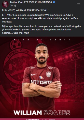 Mijlocașul brazilian a evoluat în mare parte a carierei sale în Portugalia și a venit în Gruia pentru a ne ajuta la îndeplinirea obiectivelor noastre. Bun venit la Cluj, William și cât mai multe realizări în tricoul “alb-vișiniu”! Acesta este mesajul de pe pagina de Facebook a formației CFR Cluj.
