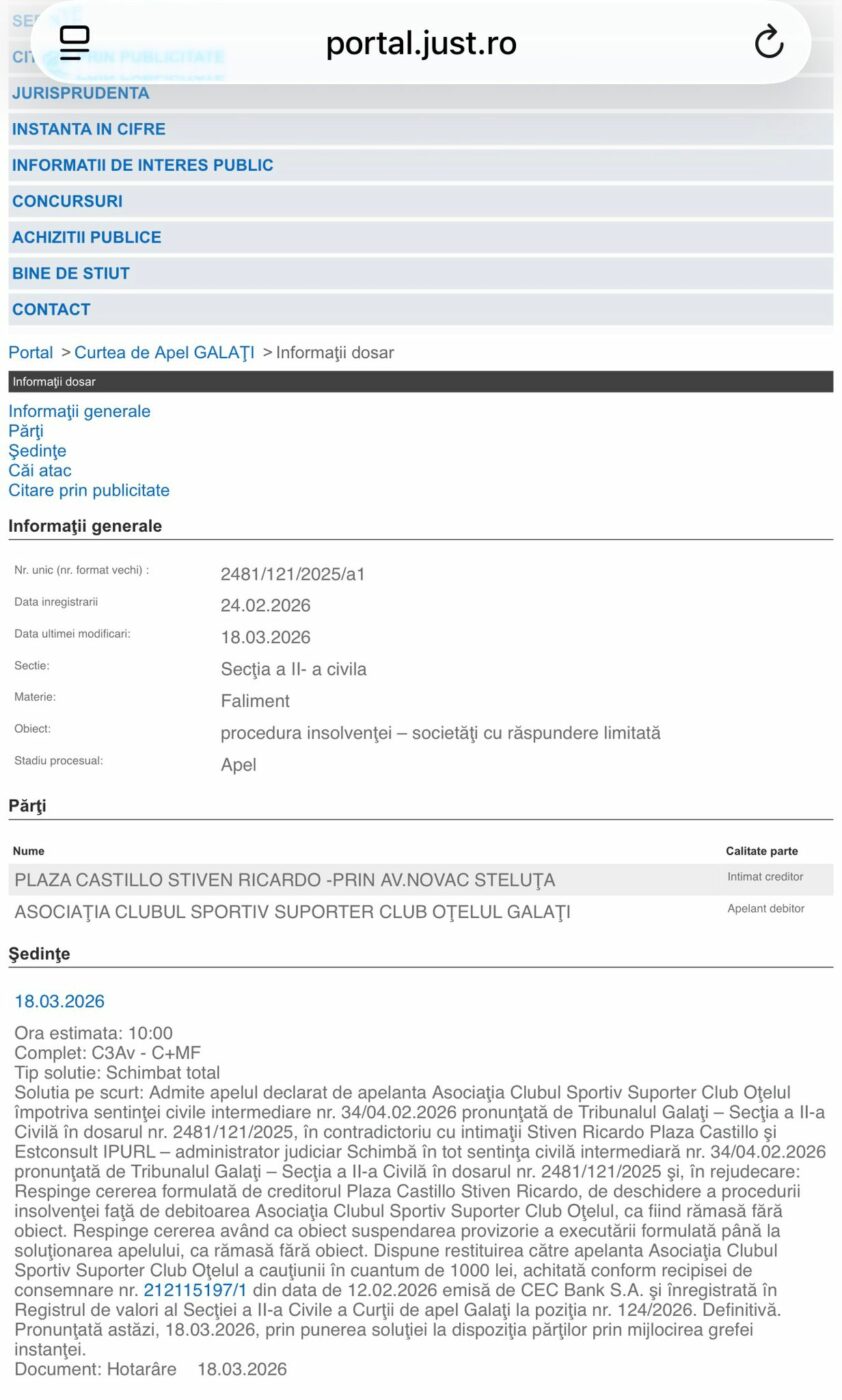 Oțelul Galați a avut emoții neașteptate luna trecută, atunci când Tribunalul Galați a deschis procedura de insolvență la solicitarea unui creditor care a pretins o datorie de 10000 lei, o parte din restanțele contractuale ale clubului către el. Este vorba de fotbalistul ecuadorian Plaza Castillot Steven Ricardo, cel care a evoluat la malul Dunării în perioada 24 ianuarie- 22 mai 2025.