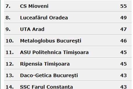 *locurile 16-20 retrogradează. În acest moment, ultimele patru echipe sunt deja retrogradate matematic, dar situația s-ar schimba în cazul în care Pandurii va fi sancționată cu 9 puncte.