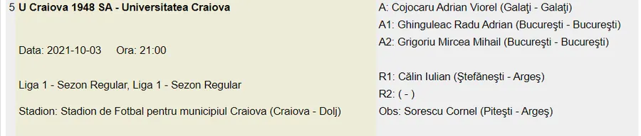 Derby-ul U Craiova 1948 – Universitatea Craiova este programat duminică, 3 octombrie, ora 21.00, în etapa a 11-a din Liga 1, sezonul 2021 – 2022, meciul urmând a fi condus la centru de Adrian Cojocaru din Galați.