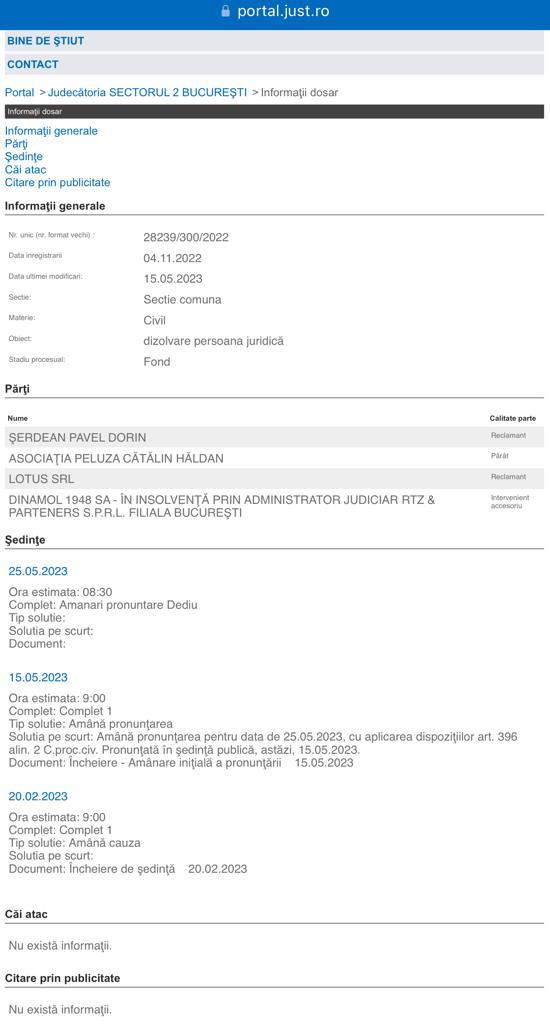 Început de săptămână foarte important pentru Dinamo, la chiar o zi după ce clubul a împlinit 75 de ani. La Judecătoria Sectorului 2 și, mai apoi, la Tribunal, se judecă, astăzi, două dintre cele mai importante procese pe rol pentru Dinamo. Primul a fost deschis de Dorin Șerdean, prin firma Lotus, fostul acționar majoritar din „Groapă”, și cere dizolvarea APCH. Cel de-al doilea vizează noul plan de reorganizare al SC Dinamo 1948 SA, al treilea propus de la intrarea formației din „Ștefan cel Mare” în cea de-a doua insolvență. ProSport, prezent la fața locului, vă prezintă toate detaliile importante pentru alb-roșii: personajele care și-au făcut apariția, contestațiile creditorilor și deciziile luate. Totul are loc chiar în ziua derby-ului cu Steaua, de pe Arena Națională, partidă ce poate prelungi șansele trupei antrenate de Ovidiu Burcă la promovarea directă sau „pecetlui” soarta „câinilor” la baraj.
