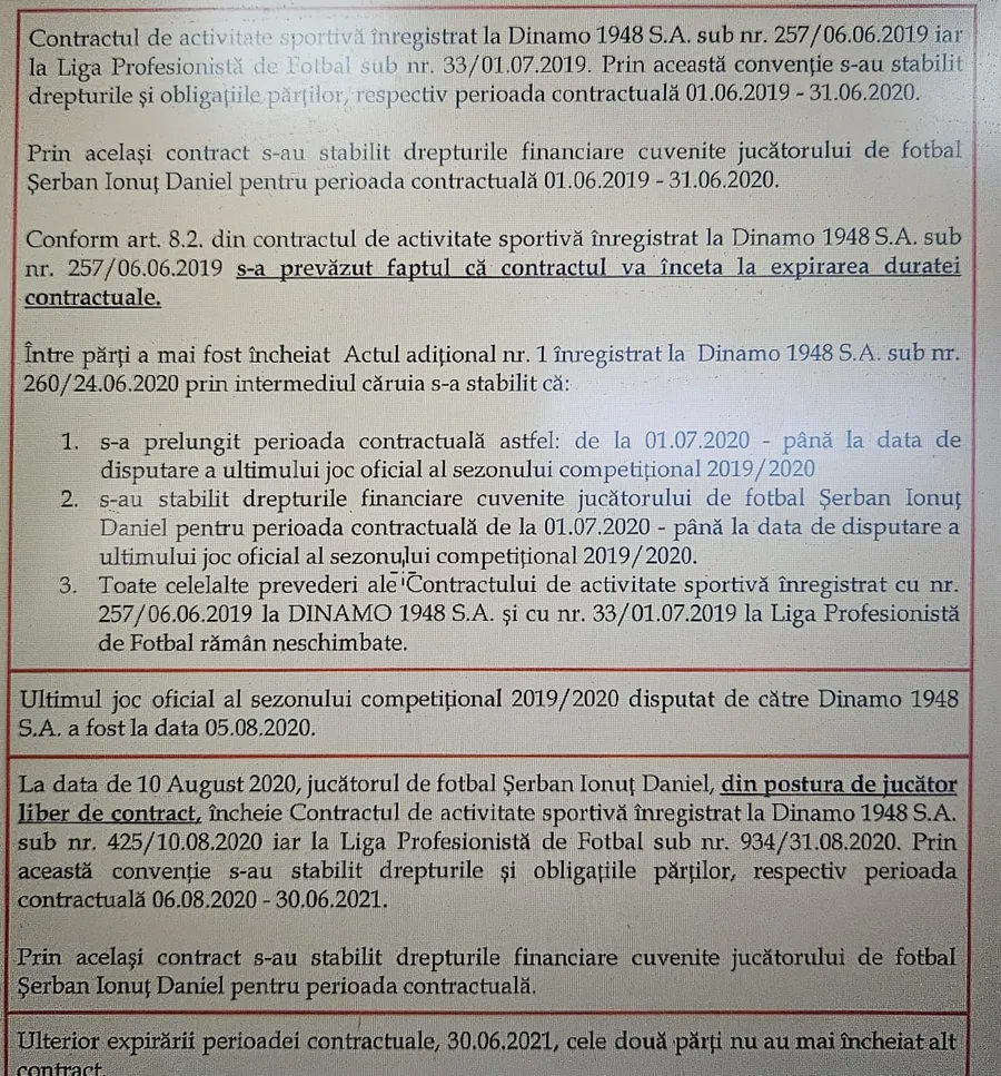 În menghina acestei înțelegeri, Șerban a rămas la Dinamo timp de 8 ani. Inițial, fotbalistul a semnat o înțelegere valabilă pentru 5 ani, apoi mai multe contracte de activitate sportivă / convenții civile (VEZI FACSIMIL JOS) care s-au întins până la jumătatea lui 2021 prin care, cel mai probabil, salariul său a fost modificat.